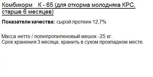 К-65 для откорма молодняка КРС старше 6 месяцев (гранула - диаметр 4,0мм, длина 15-20мм) |