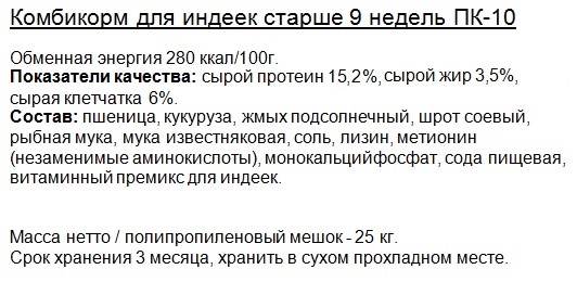 ПК-10 для индейки старше 9 недель (мелкая гранула - диаметр 2,5мм, длина 10-13мм) |
