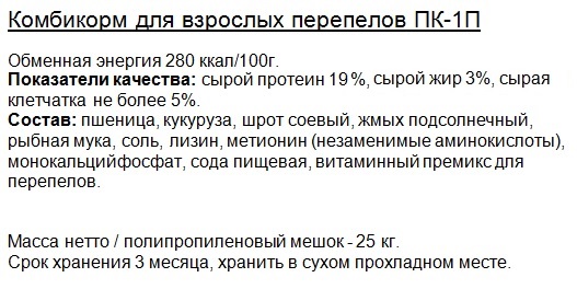 ПК-1П для взрослых перепелов (мелкая гранула - диаметр 2,5мм, длина 4-6мм) |