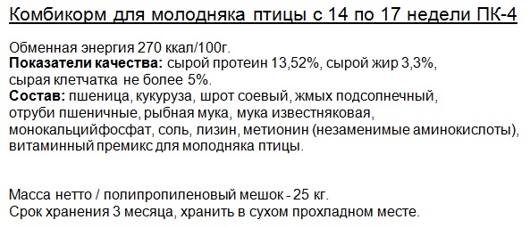 ПК-4 куры молодки с 14 по 17 недели (мелкая гранула - диаметр 2,5мм, длина 4-6мм) |