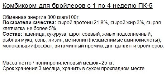 ПК-5 для бройлеров с 1 по 4 неделю (мелкая гранула - диаметр 2,5мм, длина 4-6мм) |