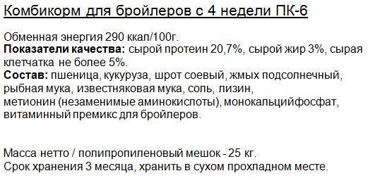 ПК-6 для бройлеров старше 4 недель (мелкая гранула - диаметр 2,5мм, длина 10-13мм) |