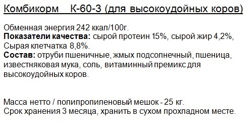 К-60-3 для высокопродуктивных коров (гранула - диаметр 4,0мм, длина 15-20мм) |