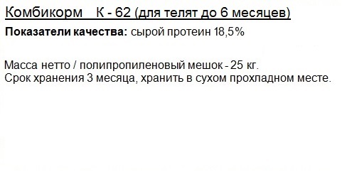 К-62 для телят до 6 месяцев (гранула - диаметр 4,0мм, длина 15-20мм) |