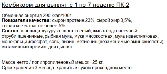 ПК-2 для цыплят с 1 по 7 неделю (мелкая гранула - диаметр 2,5мм, длина 4-6мм) |