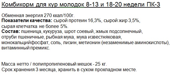 ПК-3 куры молодки с 8 по 13 и с 18 по 20 недели (мелкая гранула - диаметр 2,5мм, длина 4-6мм) |
